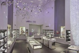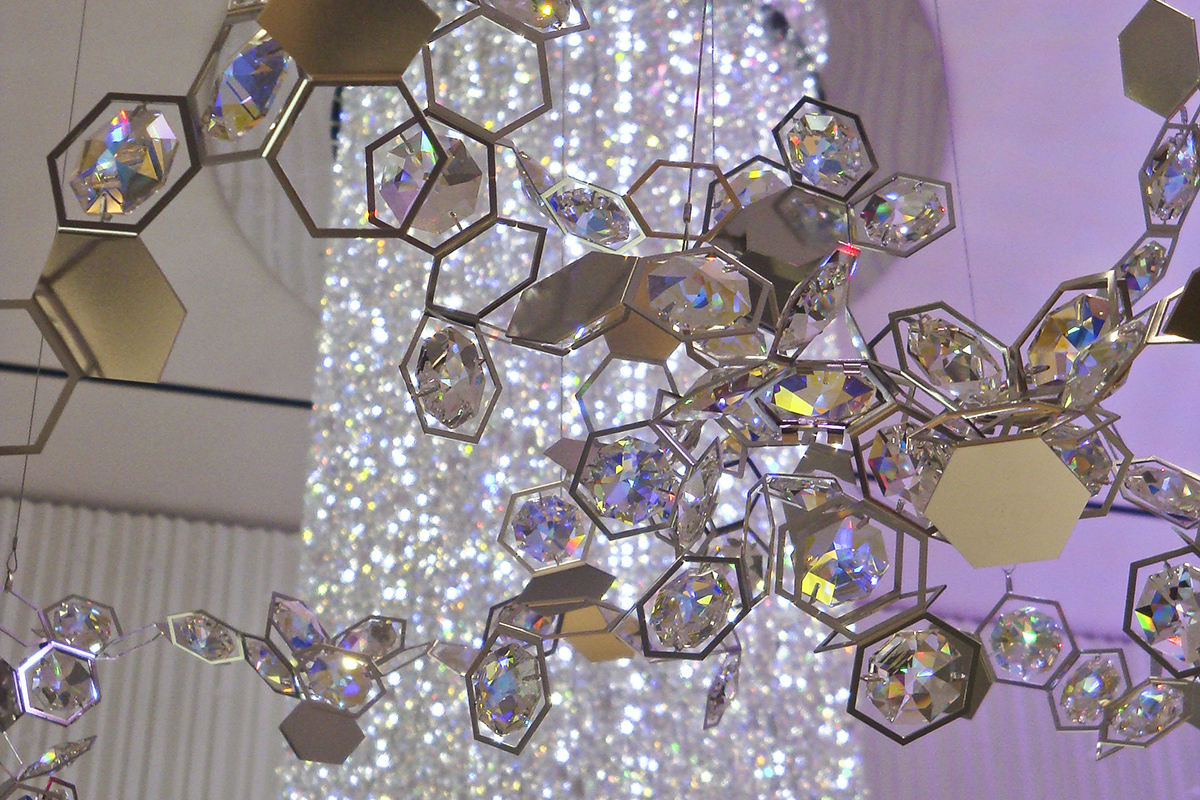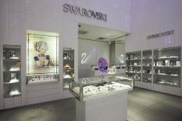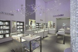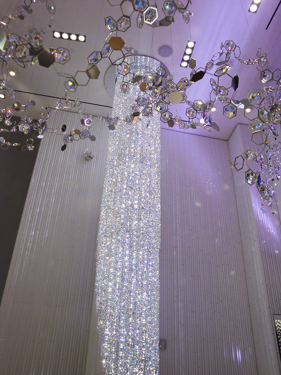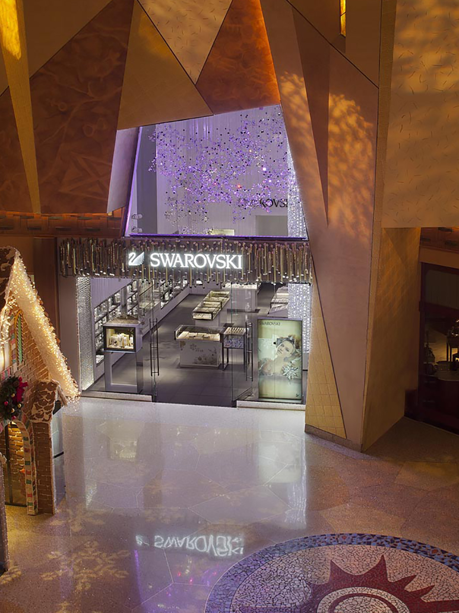 When Swarovski opened a retail store at the Mohegan Sun Casino in Uncasville, CT they called on Orion to develop exclusive fixtures for the space. On the interior of the store, Swarovski wanted to incorporate a large crystal column to be seen through the reveal window at the store front. The result was a towering stream of crystal strands standing over 25 feet tall which showers the viewer with glimmering light.