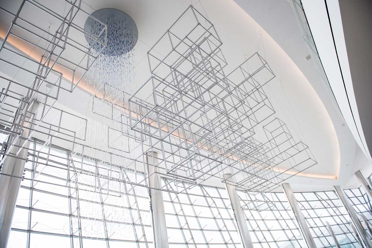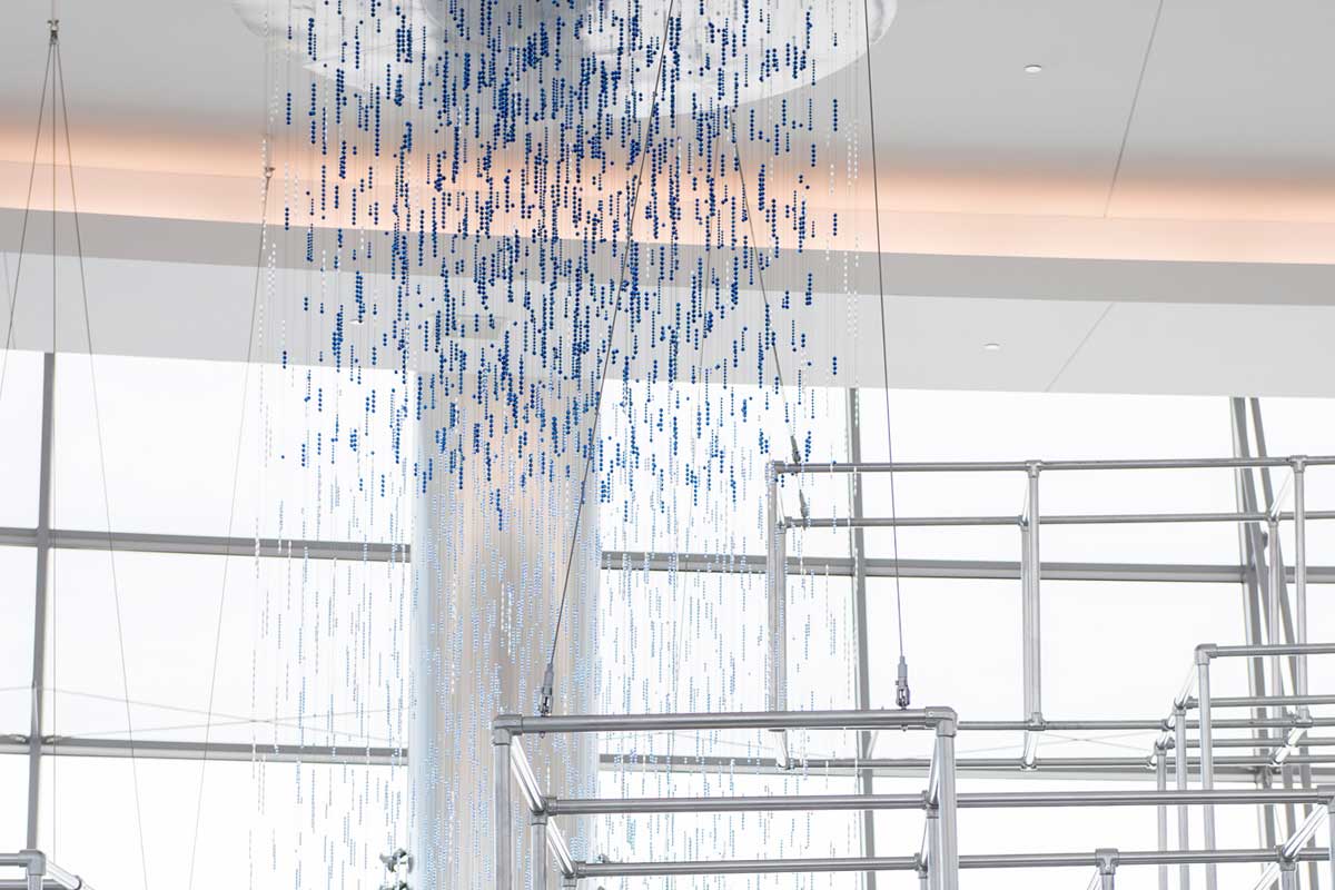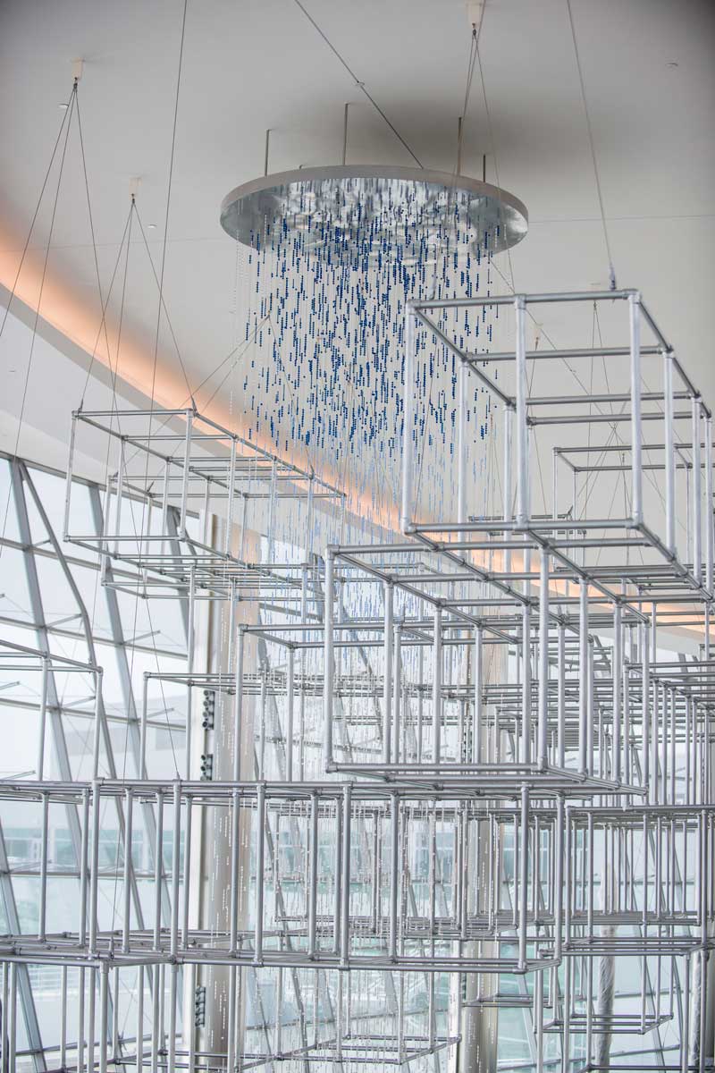 How do you create a large scale art installation that resembles a rainstorm, without the use of water, and still have it look realistic? – That was the question the Orion team had to answer from the start of the project. With Keeler’s guidance and direction, to stay true to his vision, Orion engineered the rainstorm with nothing other than strands of Swarovski crystal and aluminum tubing to create this massive structure that would hang above the heads of travelers in the middle of the terminal’s food court.