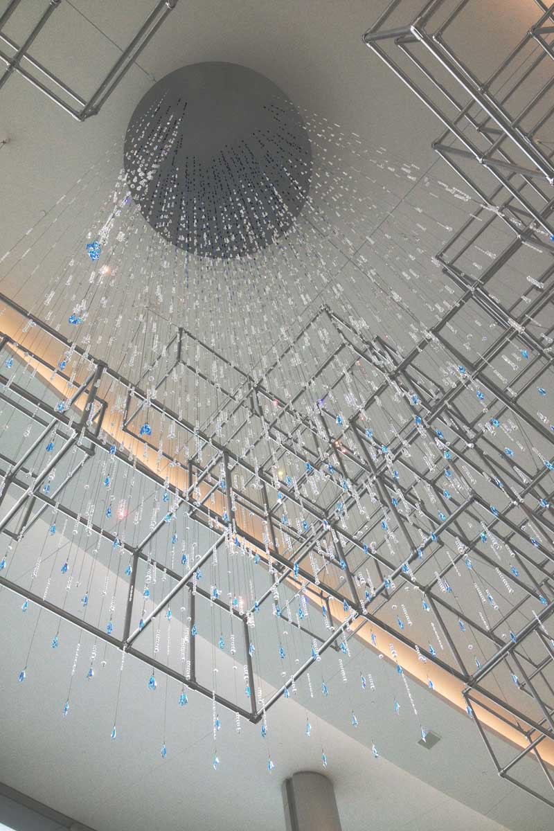 In the end, Orion created a canopy that held 261 strands of approximately 35,000 Swarovski crystals. The crystals were a mix of blues that Keeler chose based on the blues found in a San Diego sky. The abstract formation of lattice clouds, commonly found in warm coastal climates, take the shape of a lattice grid structure. The entire piece spans a total distance of 65’Lx45’W and is 27’ in height. The structure gracefully hangs 17’ above the food court below. Photos : Frank Rogozienski
